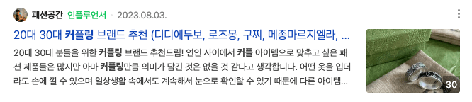 1번의 SNS 채널을 운영하는 것과 검색 엔진 최적화도 어느정도 연관이 있습니다. SNS 채널을 운영하면 자연스럽게 콘텐츠를 발행하게 되는데, 이 콘텐츠가 검색 엔진에 노출되어 사용자를 유입 시키는 역할을 합니다. 사람들은 단순히 “커플링” 이라고 검색 하기 보다 “20대 커플링 브랜드 추천” 과 같은 방식으로 검색을 하는 경우가 많습니다. 이때 “직접 써보고 비교하는 20대 30대 커플링 브랜드 추천” 과 같은 콘텐츠가 있다면 잠재고객이 유입될 확률이 매우 높습니다.