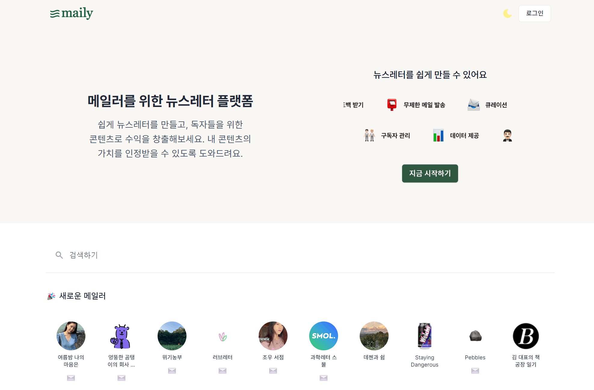 메인 화면의 직관적이고 심플한 UI/UX가 노션의 스타일과 비슷합니다. 스티비나 브런치 등 다른 플랫폼의 콘텐츠를 쉽게 가져올 수 있고, 메일리 내에서 유료 구독 멤버쉽 운영이 가능한 장점이 있습니다. 구독자 관리 시스템이나 트리거 대응, 이메일 성과 분석 및 통계와 같은 대부분의 기능이 개인 사용자에게는 무료이나, 사업자라면 유료로 일정 비용을 내야 합니다.