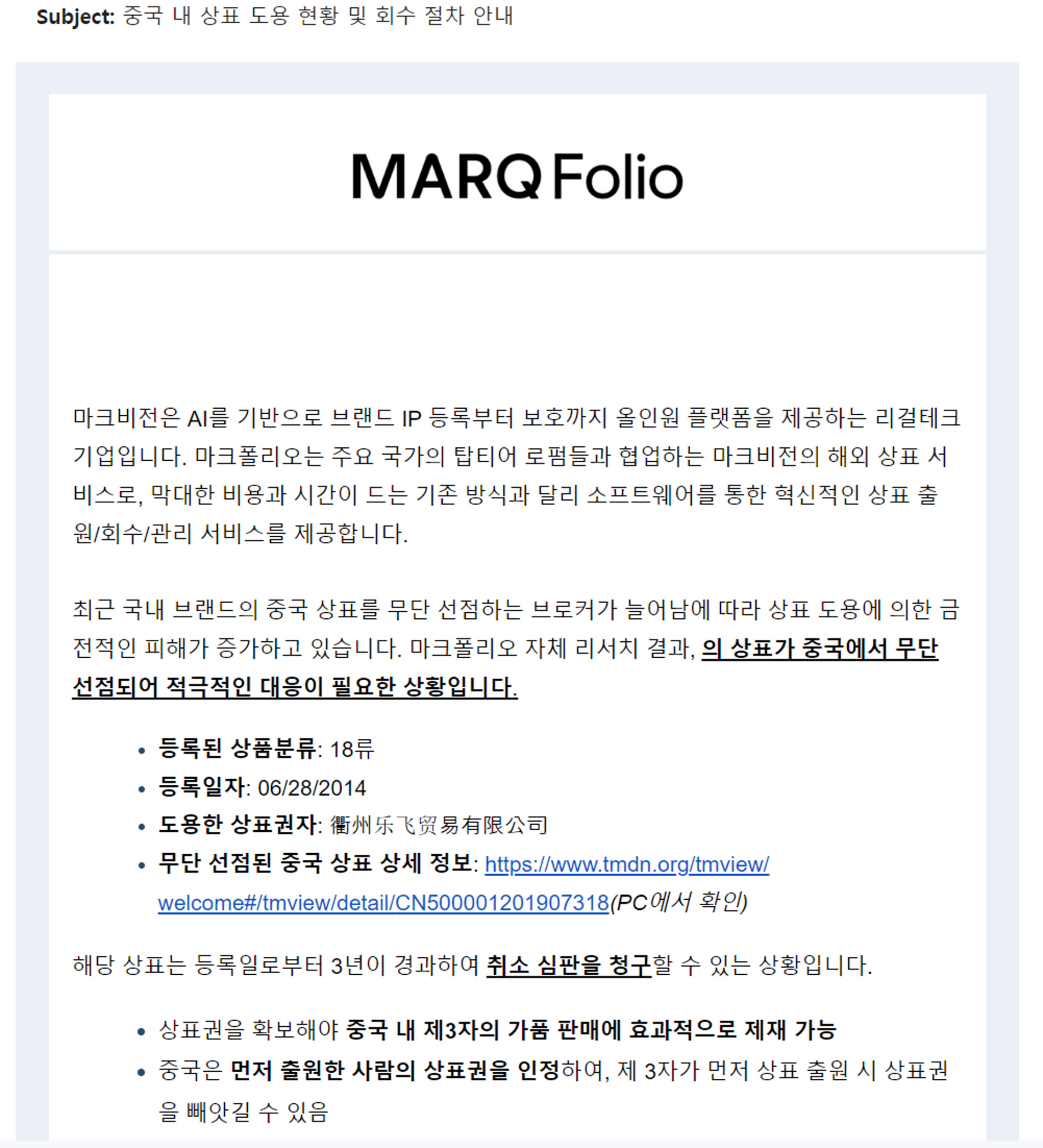 '도용'이라는 위협적인 단어로 시작해 회수 절차까지 친절하게 알려주는 메일입니다. 브랜드 IP 도용 문제을 알려주는 메일이어서 황급히 열었으나 급하게 처리해야 할 사안이 아닌 것으로 보여 괜히 겁만 주는 메일로 스팸처리해두었습니다.