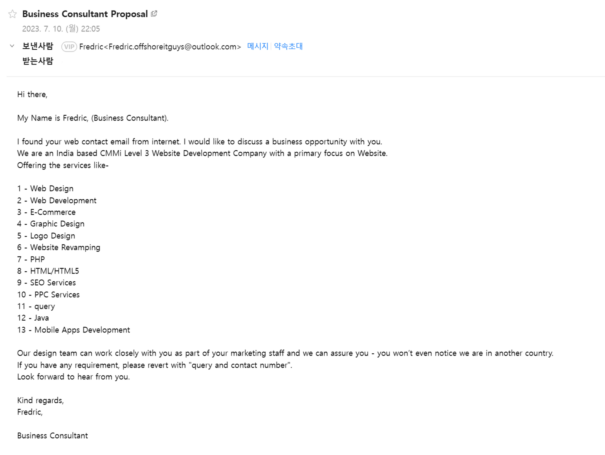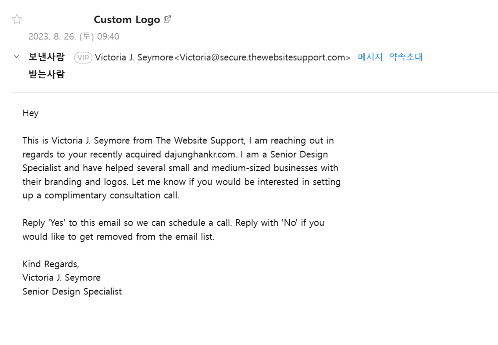 본인을 디자인 스페셜 리스트라고 어필했으나 포트폴리오나 웹사이트 등 제공하는 서비스를 도통 알아볼 수 없어서 패스한 메일 입니다.